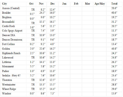 If you felt like it was a snowy December here in Denver, you are not alone, and you are not wrong. Denver had below above normal snowfall for many areas. While Denver only had three meaningful snow events, most of the snow fell between December 28th and December 29th, with areas receiving five to ten inches from this event alone. Denver International Airport officially reported 13’ of snow in December which is 6.4” above the normal of 6.6”. A strong arctic cold front moved thru on the 21st and resulted in a one-hour temperature drop of 37 degrees at Denver International Airport, which is now the largest 1-hour temperature drop in Denver history. Brrrrrrr!